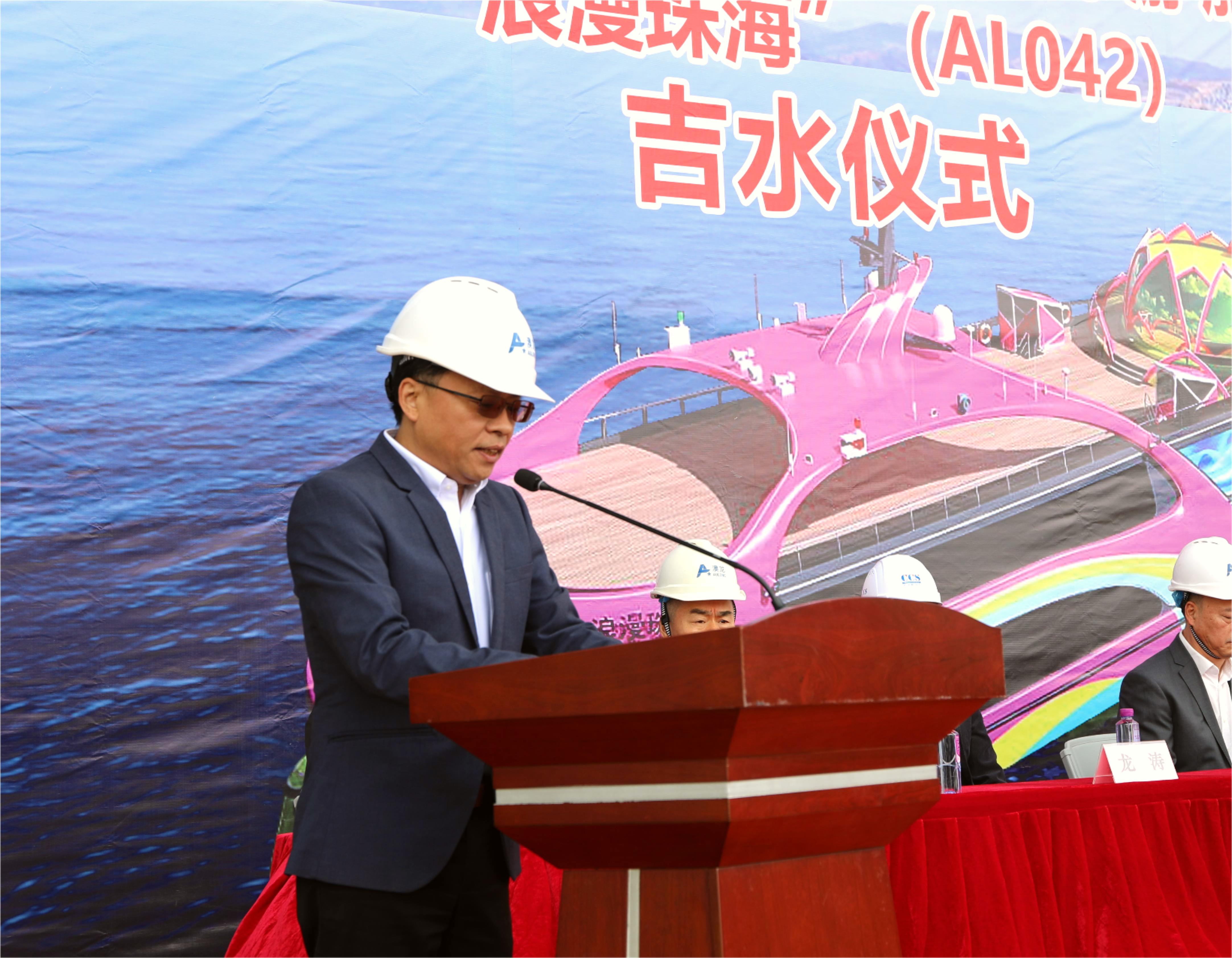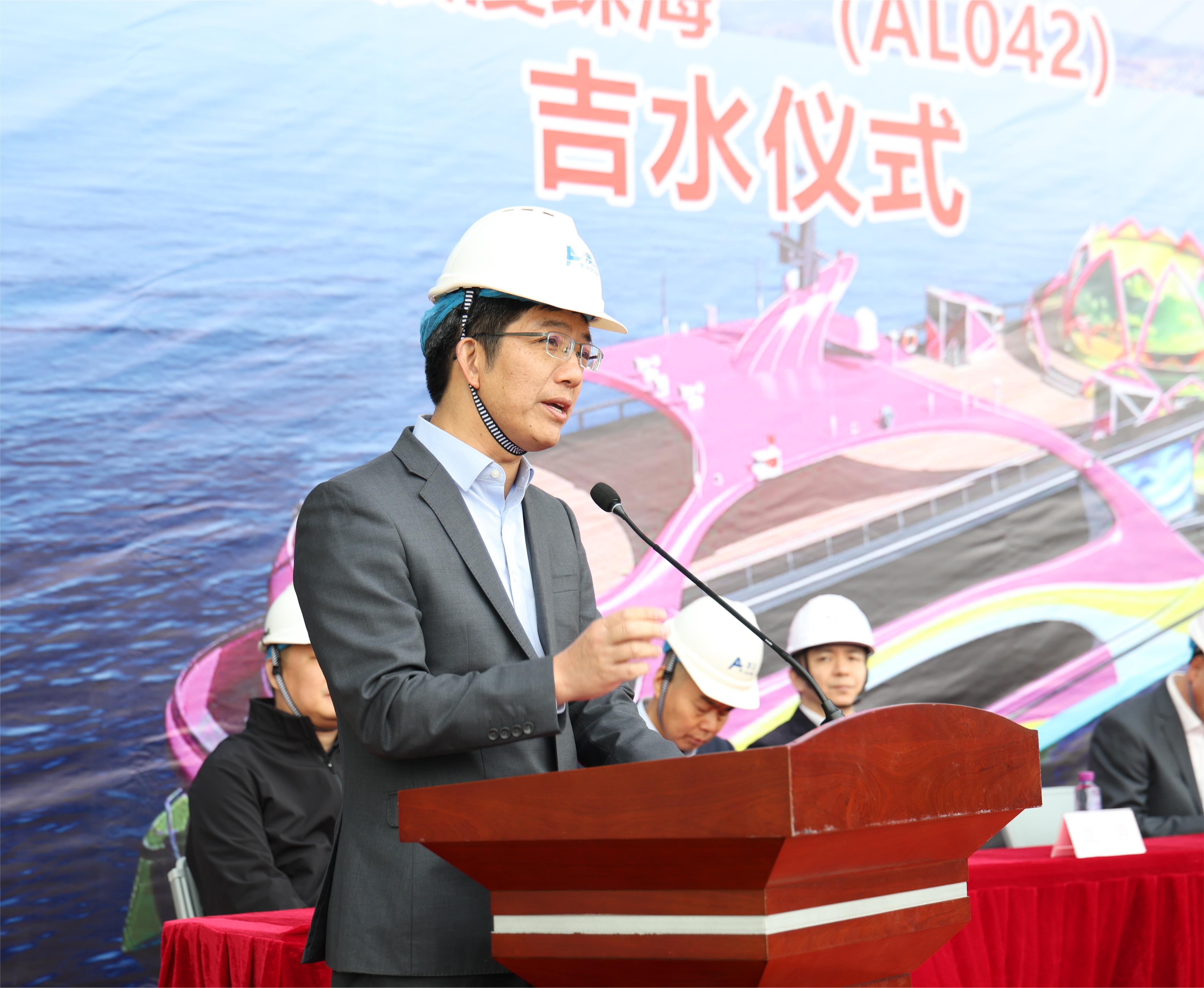 Recently, the launching ceremony of the "LANG MAN ZHU HAI" of the Blue SeaJet was grandly held in Auong. Mr. Li Jianbin, the chairman of Zhuhai Blue SeaJet, Mr. Long Tao, the deputy general manager of the Zhuhai Branch of CCS, Mr. Xu Qiang, the deputy general manager of Wuhan Yangtze River Ship Design Institute, Mr. Su Qinglong, the deputy general manager of Zhuhai Ocean Development Group, Mr. Xi Fangyuan, the executive director of Jianglong Boat Company, and Mr. Shen Hui, the general manager of Aulong, among others, attended the launching ceremony and jointly witnessed this historic leap in the development of green shipping.